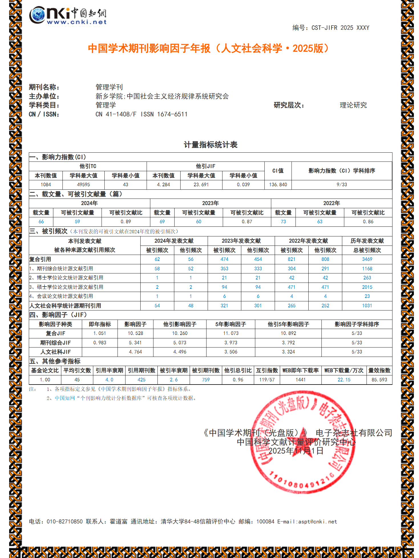 日前收到《中国学术期刊(光盘版)》电子杂志社有限公司与中国科学文献计量评价研究中心联合发布的《中国学术期刊影响因子年报(人文社会科学·2025版)》(下称《年报》)。《年报》显示《管理学刊》2025年复合影响因子为10.528,较2024年的8.255提高了28个百分点,在全国33家同类期刊中位列第五,在河南省期刊影响因子排名中位列首位。